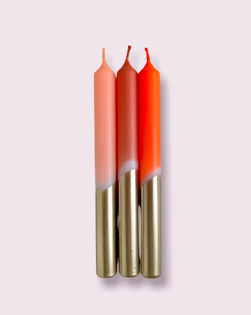 - Set of three lovingly hand-dyed candles dipped in gold. The colors remain the same, but the patterns vary for each candle, making them unique. An elegant eye catcher in home design.
