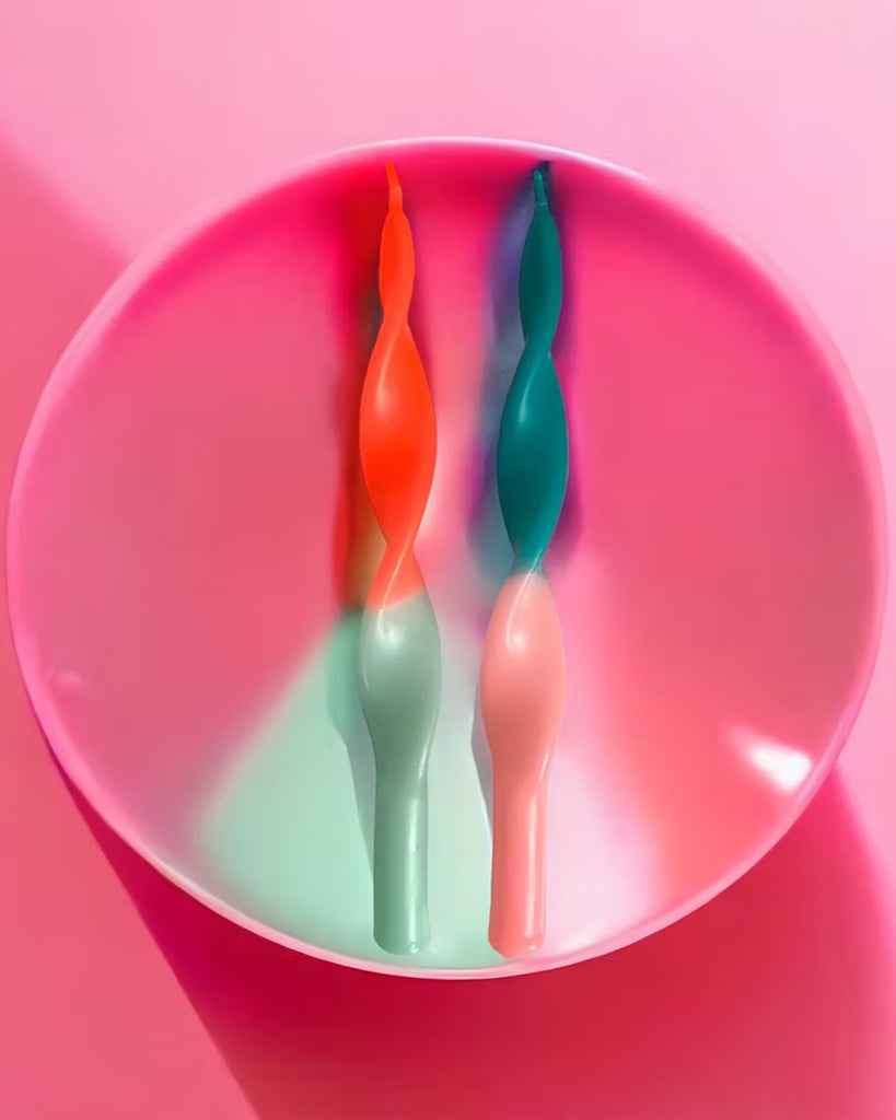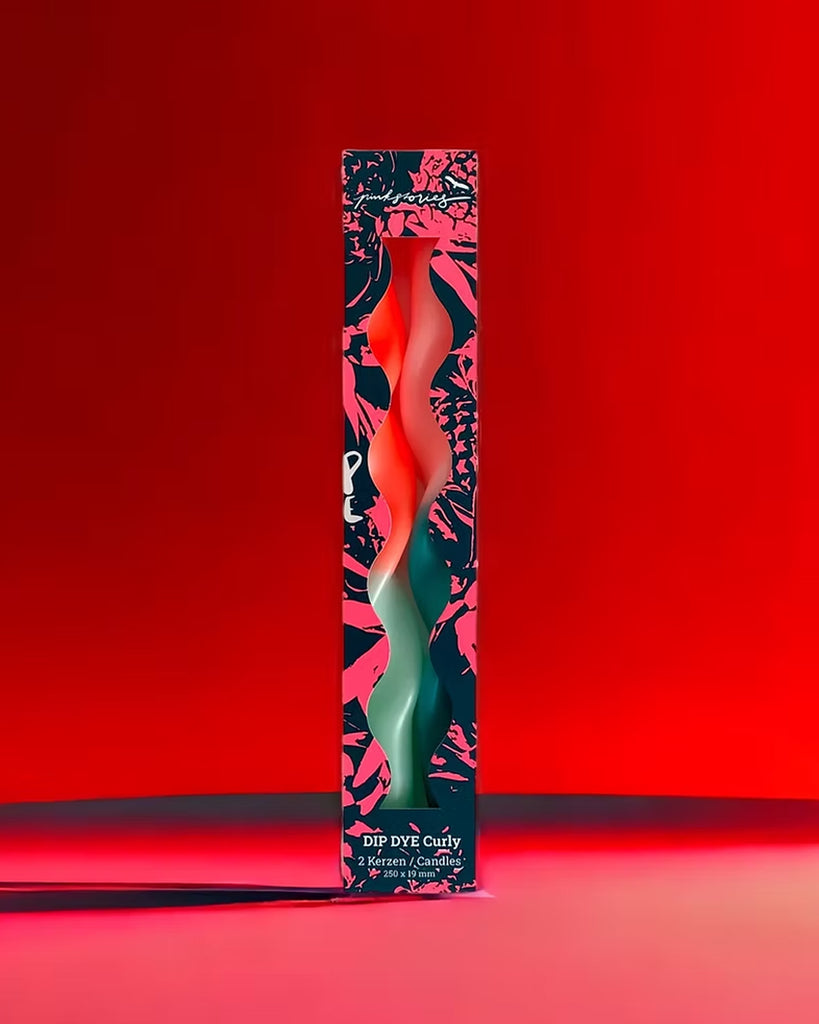 - Set of two lovingly hand-dyed candles, curly and vibrant. The colors remain the same, but the patterns vary for each candle, making them unique. An elegant eye catcher in home design.